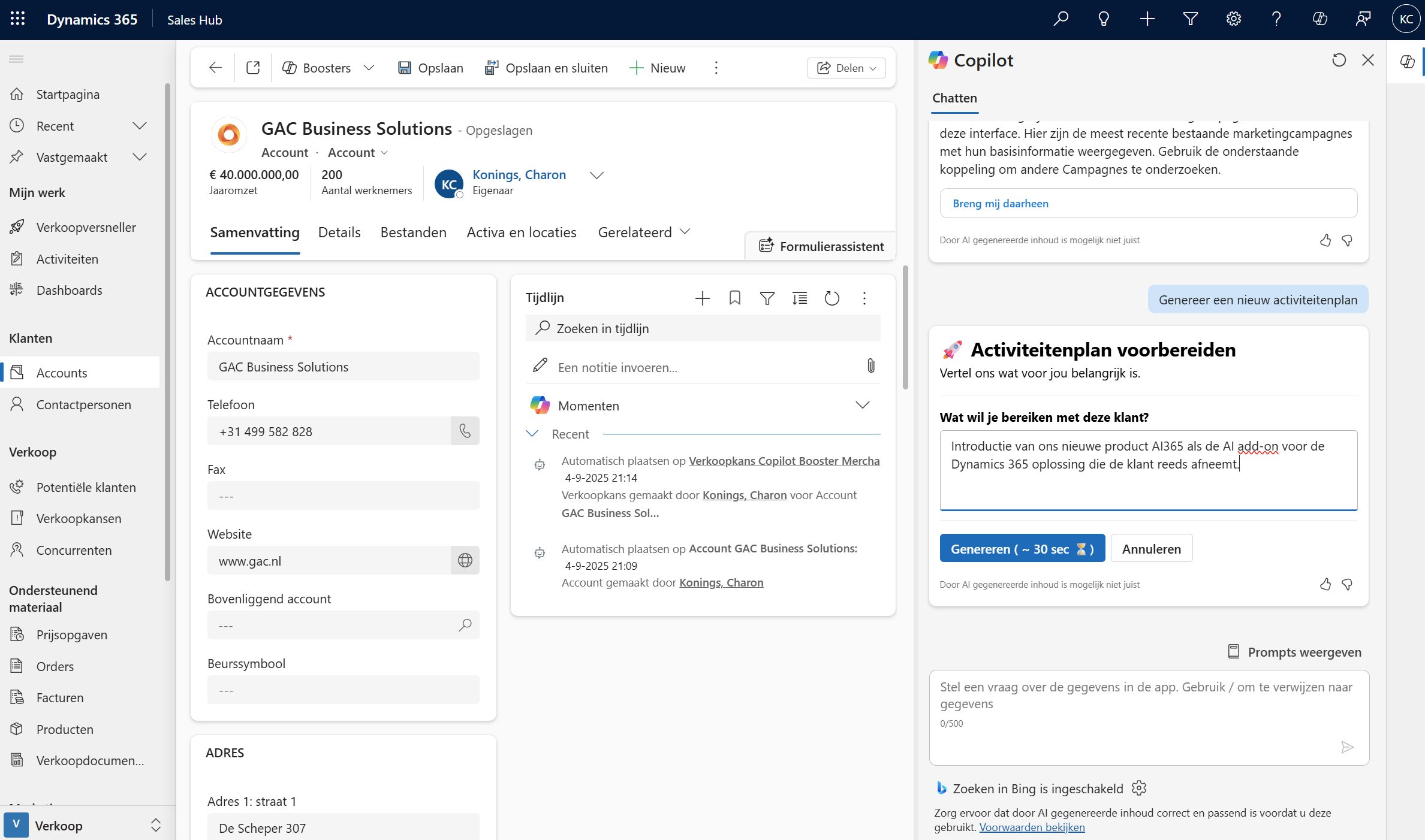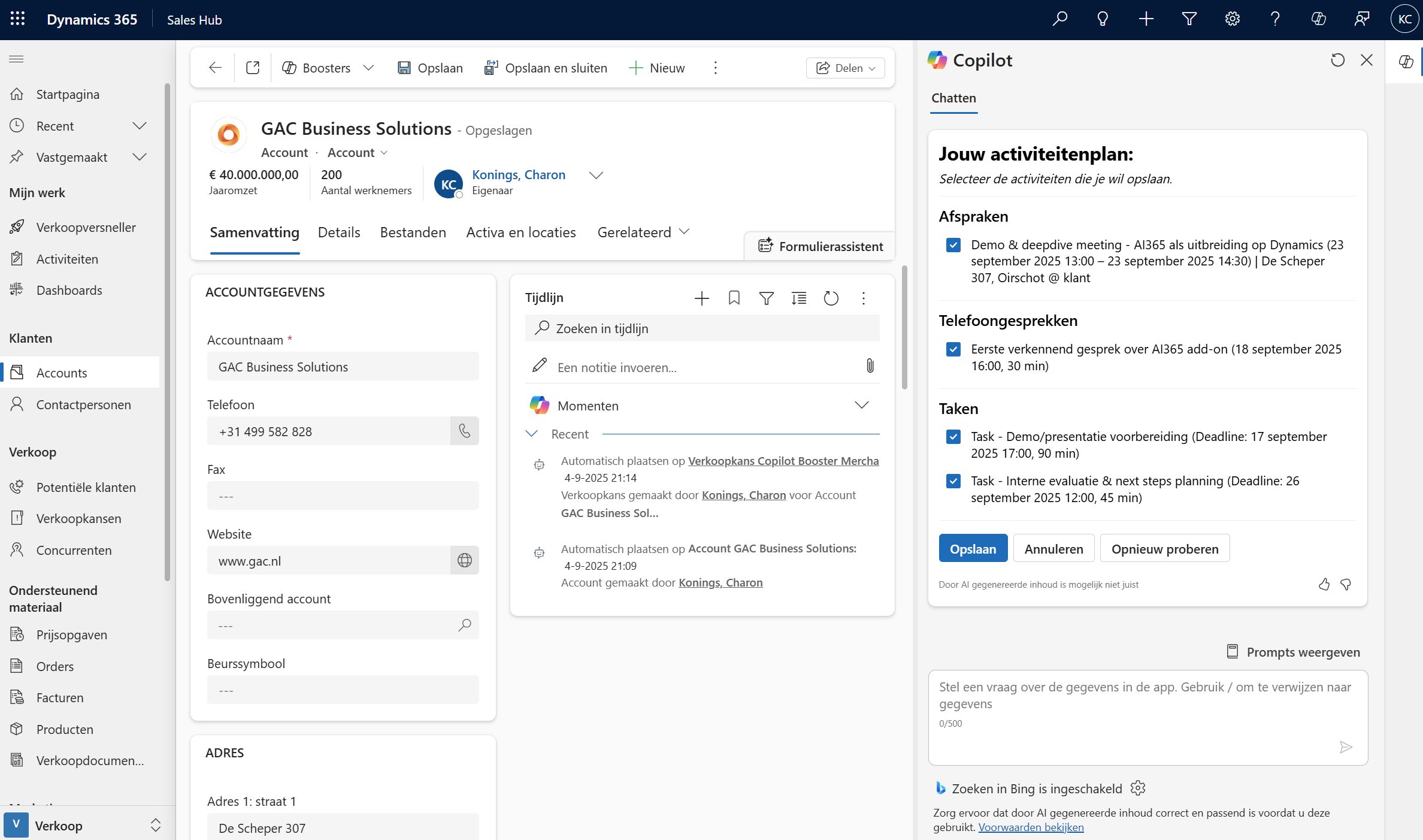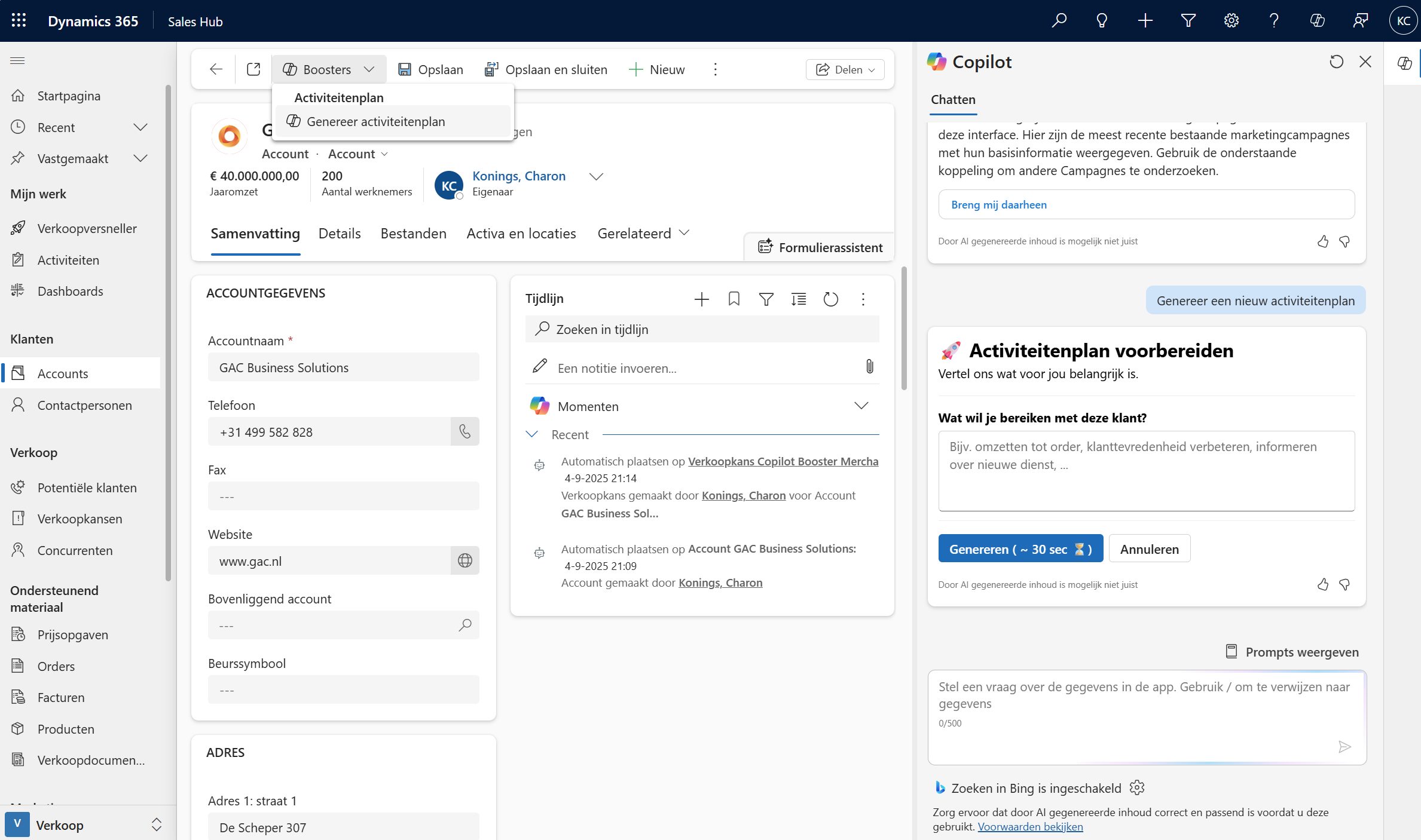 De activiteitenplan booster helpt verkopers en accountmanagers om doelgericht en gestructureerd een actieplan op te stellen voor klantaccounts in Dynamics 365 Sales. Op basis van een simpele prompt genereert AI365 automatisch relevante acties, verdeelt deze over een tijdlijn en koppelt de juiste mensen eraan.