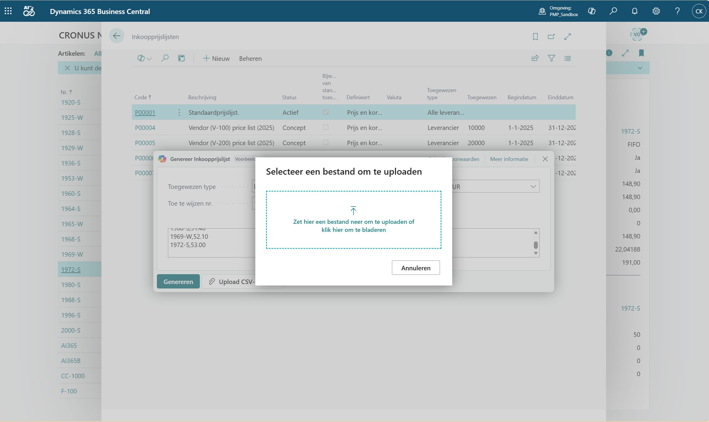 - Automatisch kolommen laten herkennen en mappen naar Business Central-velden zoals prijs, valute, start- en einddatums.