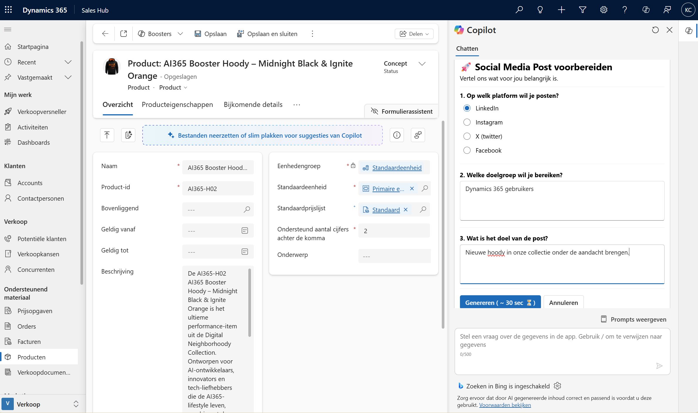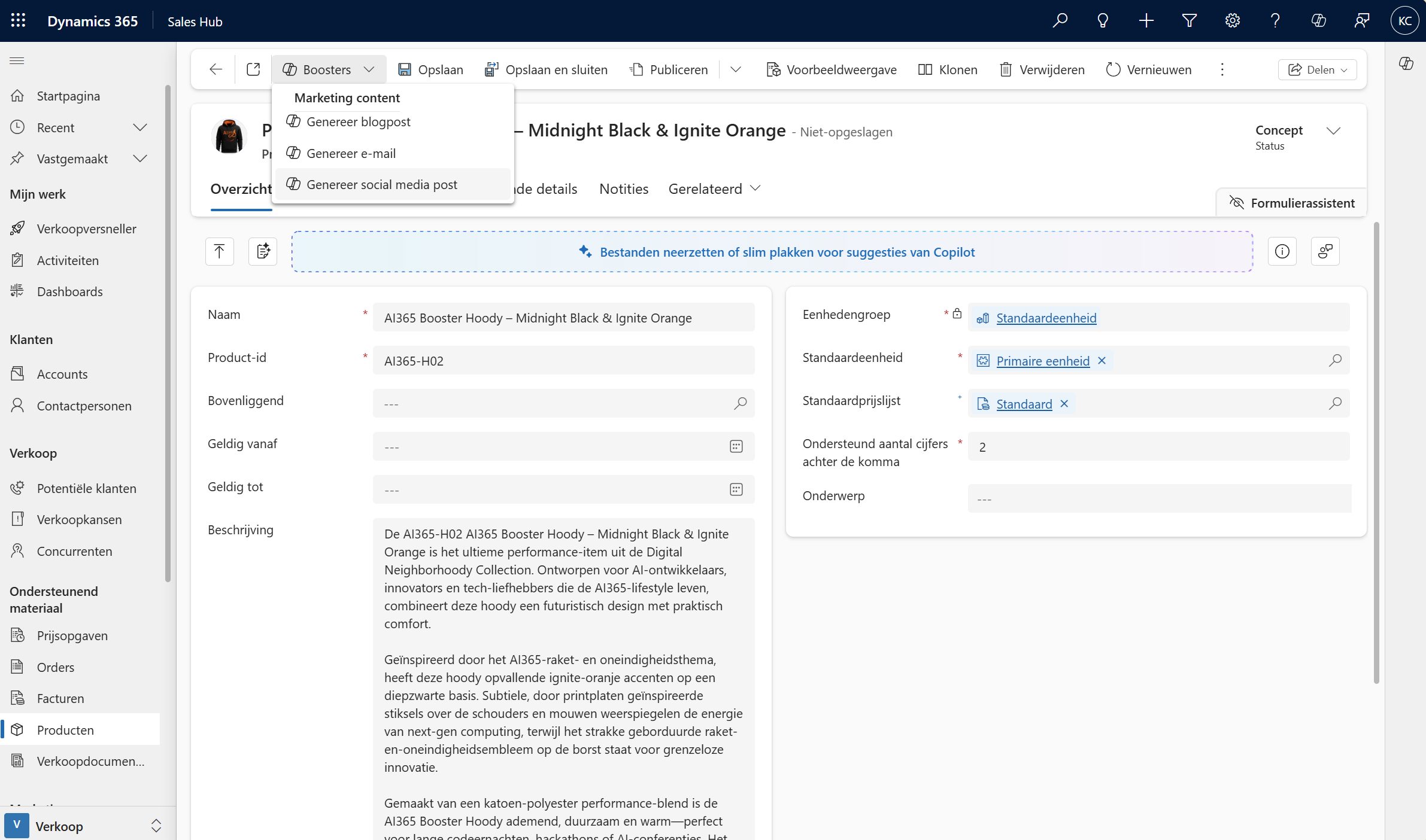 Met de marketing content booster creëer je in een paar klikken krachtige marketingteksten direct vanuit Dynamics 365 CRM Sales. Of het nu gaat om social media posts, e-mails of blogs: de AI genereert content op basis van productinformatie, campagnes en verkoopliteratuur.