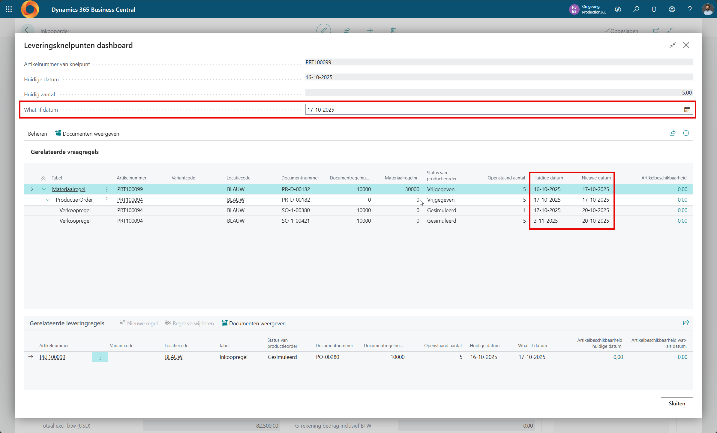 - Inzicht in welke verkooporders, projectregels en productieorders worden geraakt door een vertraagde levering.