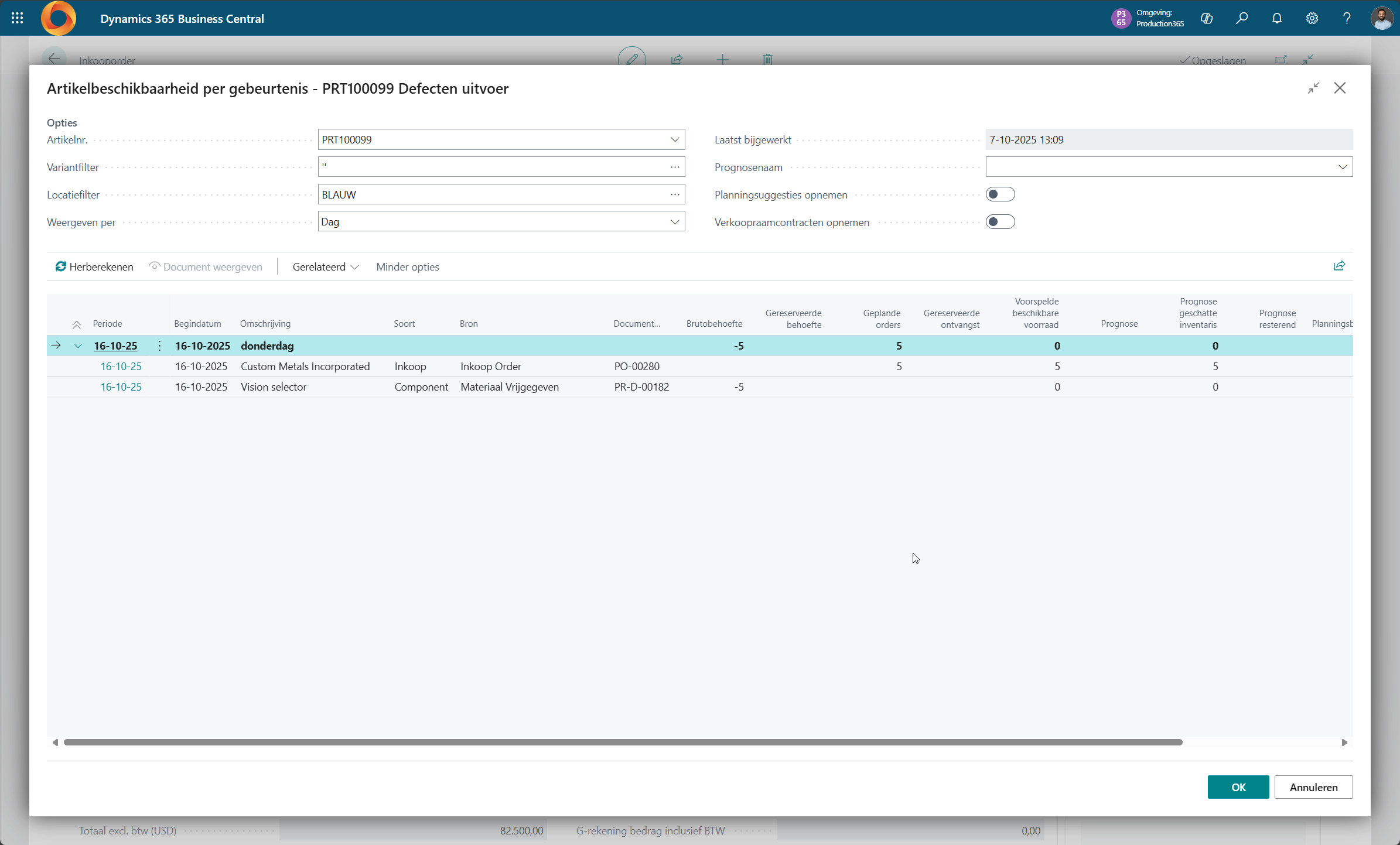 - Direct beschikbaar vanuit productieorderregels en inkoopregels met inzicht op onderliggende documenten en hoeveelheden.