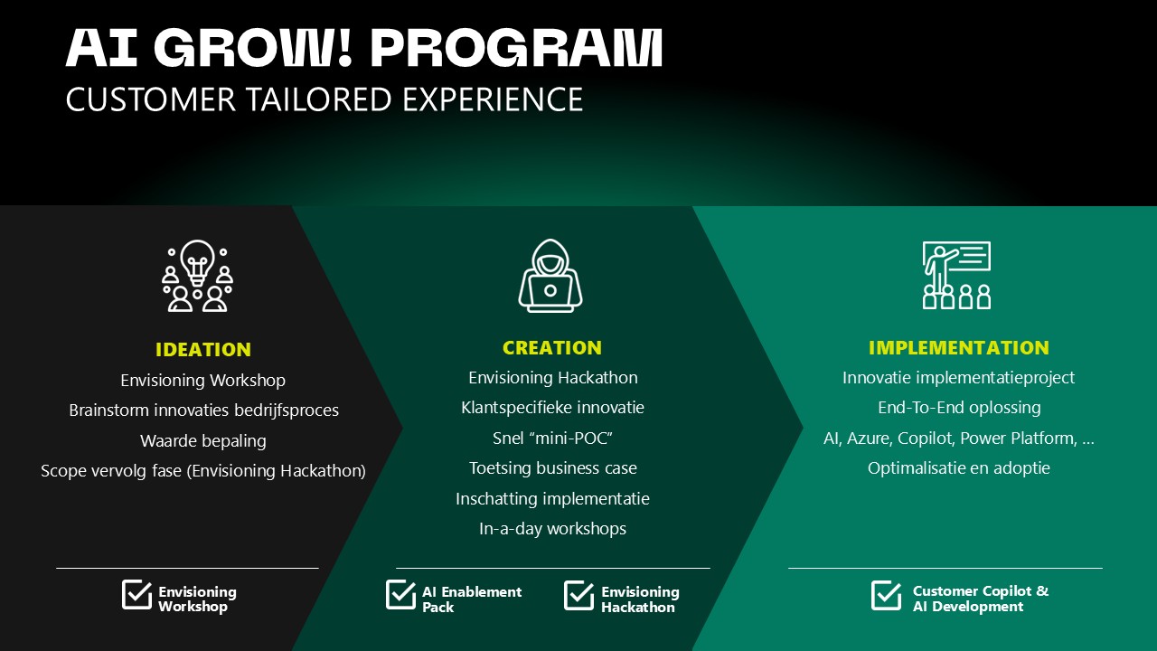 De geselecteerde oplossing wordt geïntegreerd in het Microsoft‑platform (Azure, Power Platform, Dynamics 365). Hierbij ligt de focus op adoptie, optimalisatie en schaalbare inzet van AI binnen de organisatie.
