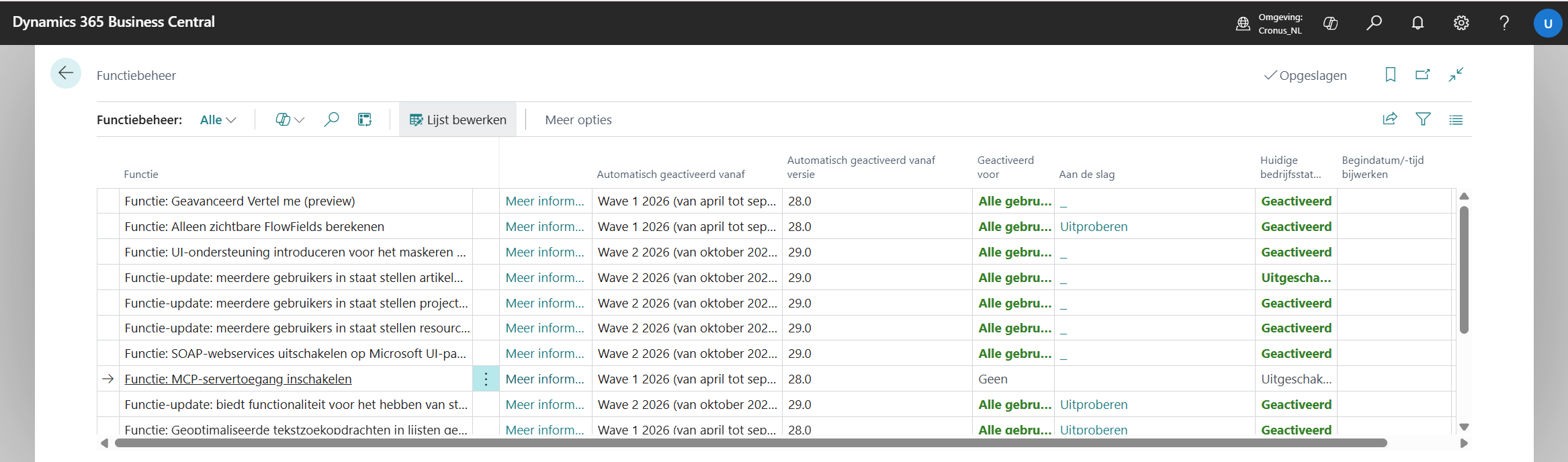 Na het updaten van je Sandbox is het tijd om de nieuwe functies zichtbaar te maken. Veel innovaties in Business Central worden namelijk niet direct automatisch geactiveerd. Dit doe je via de pagina Functiebeheer en de pagina GAC Functiebeheer. Hier vind je een overzicht van alle beschikbare functies, inclusief een korte beschrijving en status. Ook zie je hier vanaf welke release de functie automatisch wordt geactiveerd.