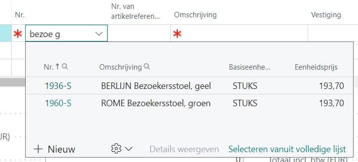 Hierdoor wordt het mogelijk om in bijvoorbeeld de verkooporderregel te zoeken naar artikelen zonder een precieze match in te hoeven voeren. De oude zoekmethode gaf geen resultaat wanneer wordt gezocht naar ‘Parijs zwart’ omdat het artikel de omschrijving ‘Parijs Bezoekersstoel zwart’ heeft.